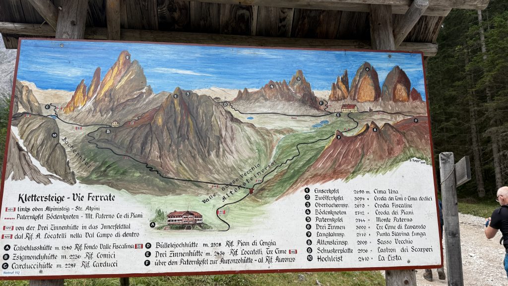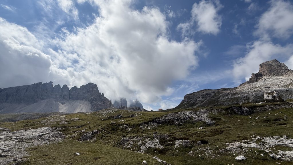 Nach einer Rast setzten wir den Aufstieg fort. Unterwegs stellten wir mehrfach die Frage, ob die vor uns liegenden Felsformationen bereits die Drei Zinnen seien, nur um beim Blick auf die Karte festzustellen, dass es noch nicht so weit war. Erst als wir ein Hochplateau erreichten, öffnete sich der Blick auf das berühmte Massiv.