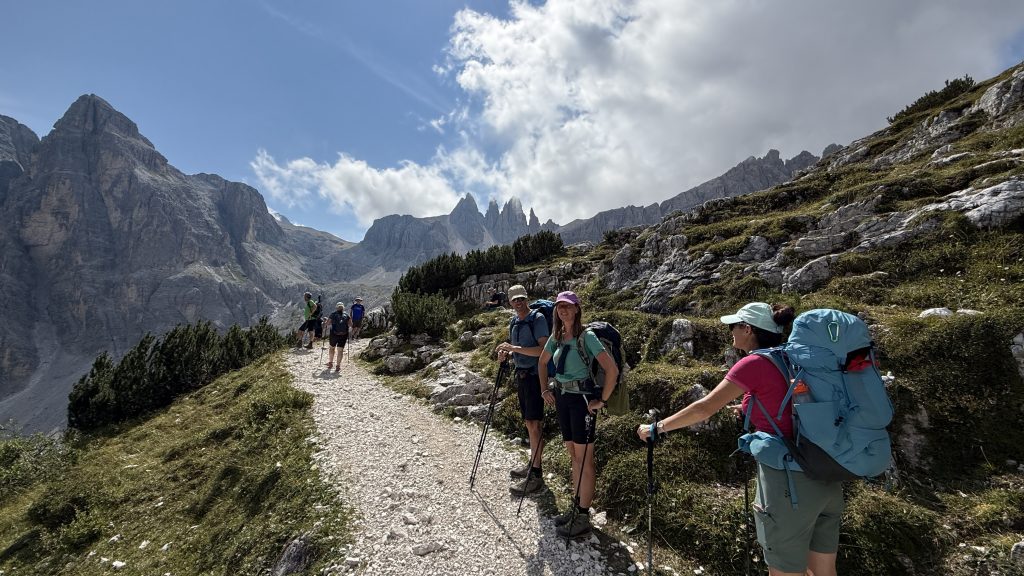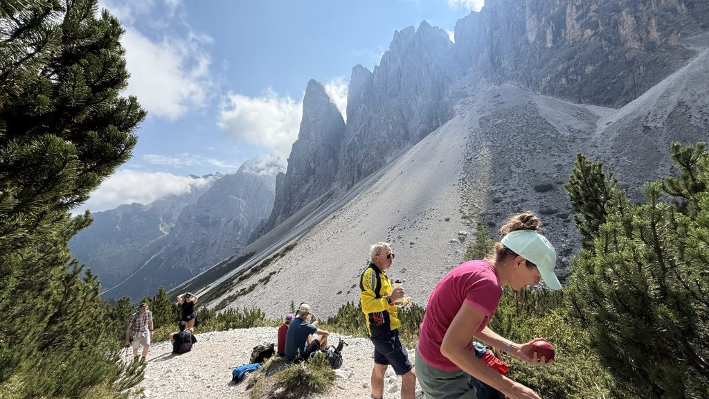 Wir hielten diesen Augenblick mit Gruppenfotos fest, bevor wir in die Drei-Zinnen-Hütte einkehrten. Trotz vieler Besucher fanden wir einen Platz und konnten eine Stärkung genießen. Anschließend machten wir uns an den Abstieg zur Drei-Schuster-Hütte.