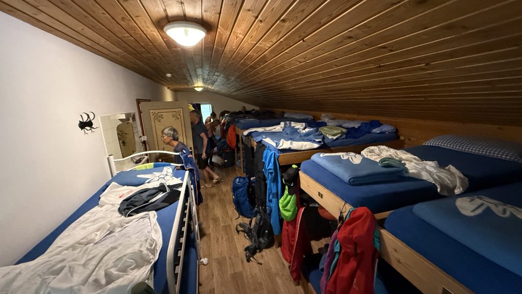 Am Abend saßen wir in der gemütlichen Gaststube zusammen. Nach dem Abendessen kam noch eine kleine Einlage hinzu: Hans führte einen Knoten-Trick vor, bei dem jeweils zwei Personen mit einem Seil verbunden wurden und sich selbst nicht befreien konnten. Auch wenn alle Versuche scheiterten, sorgte es für eine aufgelockerte Stimmung. Wir blieben so lange wie möglich im Gastraum, bevor wir schließlich ins Matratzenlager zurückkehrten. Mit Ohrstöpseln ausgerüstet, ließ sich auch dort eine einigermaßen erholsame Nacht verbringen.