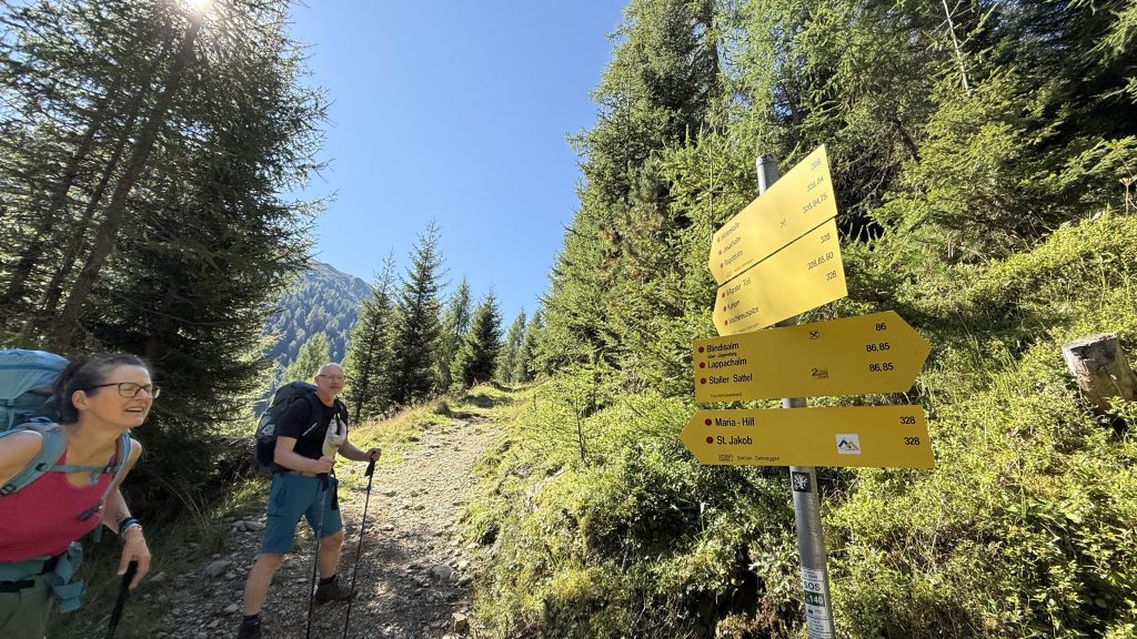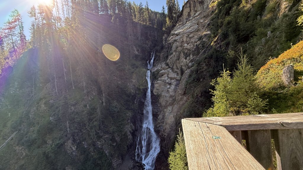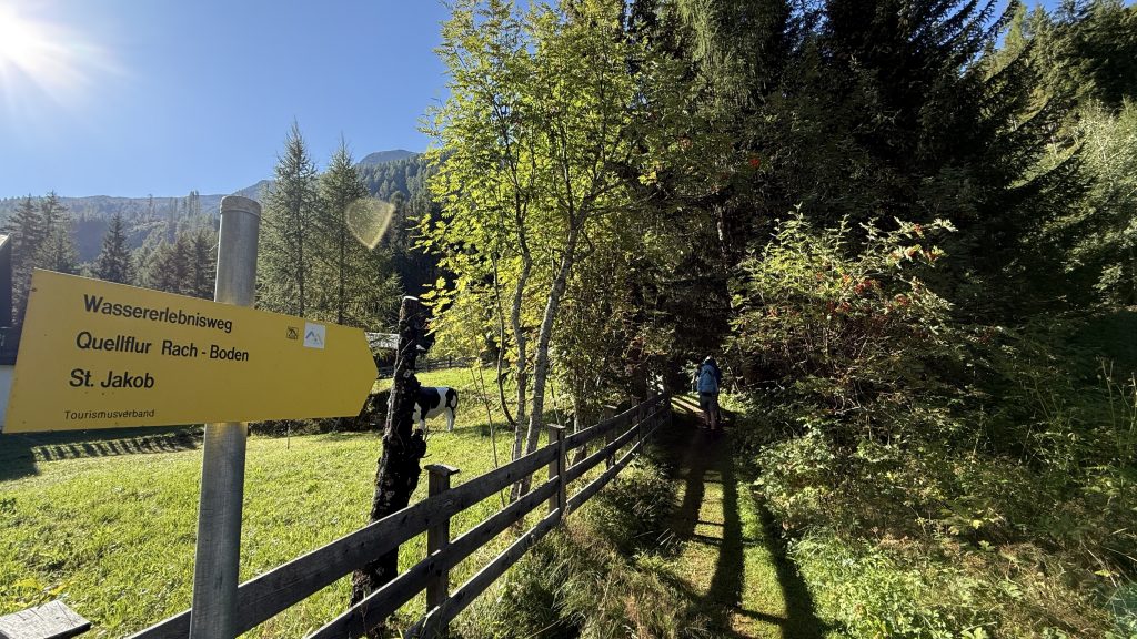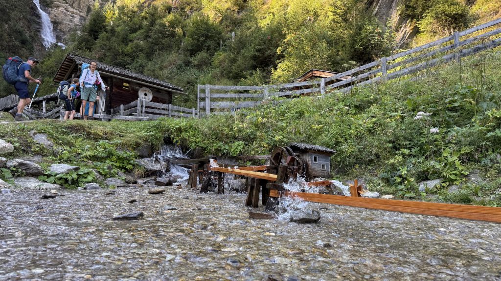 Für uns hieß es dagegen: rein in den Bus. Der brachte uns zum Startpunkt unserer Etappe in die Nähe von Sankt Jakob im Defereggental. Kaum losgelaufen, passierten wir einen Wasserfall samt kleinem Erlebnispark, der die Bedeutung der Wasserkraft für die Region anschaulich erklärte. Ein kurzer Blick, ein paar Fotos – dann zog uns der Weg weiter bergauf.