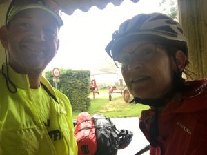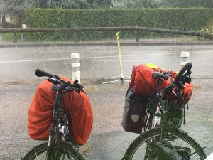 Die Fahrt führte uns zunächst über die Loire und dann ca. 10 km moderat bergauf, bevor die Gegend dann für rd. 35 km wieder den Charakter der letzten Tage mit seinen Aufs und Abs zeigte. Offene Bars oder Restaurants waren heute am Nationalfeiertag hier in Frankreich erneut Fehlanzeige. So nahmen wir bei schönem Wetter eine Notration auf einer Bank vor einer Kirche ein. Als wir weiter wollten zeigten sich erneut einige unangenehm graue Wolken, die in einiger Entfernung bereits erkennbar Ihre Fracht in Form von Regenschauern abwarfen. Nachdem wir die ersten Kilometer noch verschont blieben, fing es dann auch schon zu tröpfeln an, als wir plötzlich an einem optimalen Unterstand vorbeifuhren. In diesem stand auch noch eine bequeme Bank. Da die Mittagspause offenbar nicht die Erholung gebracht hatte, die ich zu dem Zeitpunkt gebraucht hätte, legte ich mich zur Überbrückung des Regens kurz hin und schlief fest ein. Als ich nach ca. 20 Minuten wieder aufwachte schien wieder die Sonne und weiter ging es.