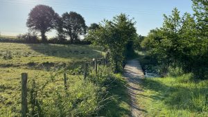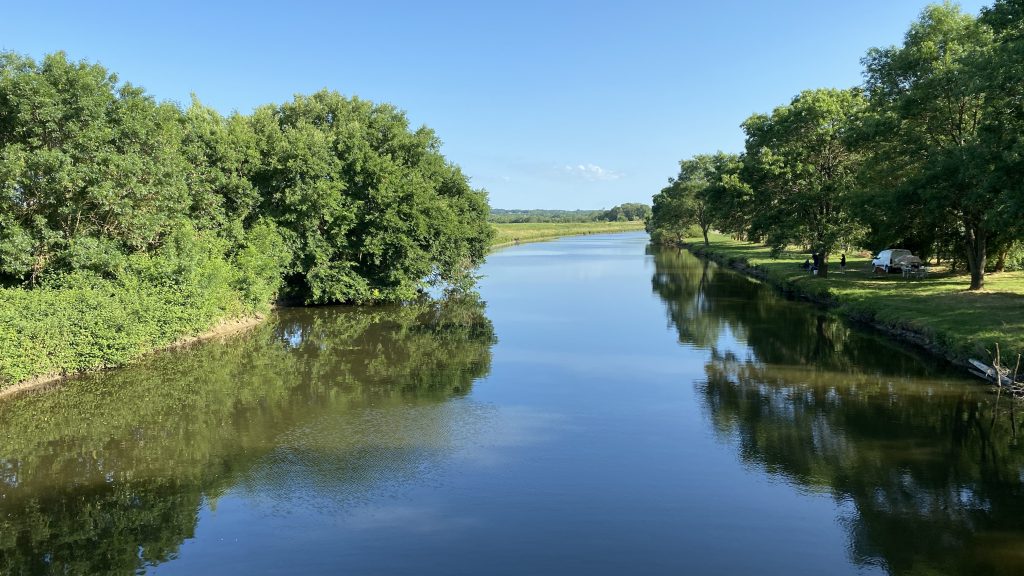 Nach einem Abschnitt, der wie in den Vortagen durch kleine Orte und über kleine Nebenstrecken führte fand sich nach fast 40 km Gelegenheit für einen kleinen Pausensnack. Direkt danach fuhr ich durch eine Gegend, die sehr stark an die Wesermarsch erinnerte. Eigentlich hatte ich mich auf diesen Abschnitt gefreut, weil die Strecke abseits von Straßen an Kanälen entlang läuft. Diesmal wurde ich leider etwas enttäuscht. Die Qualität des Weges war wirklich schlecht. Eine sehr stark verschlissene, teilweise überwuchte und mit Längsrillen durchzogene Oberfläche machte das Fahren sehr anstrengend. Das ganze wurde noch garniert durch einen fiesen Gegenwind, der ohne Hindernisse wie Bäume oder Gebäude über diese Ebene pfiff und mich doch ziemlich ausbremste. Nach fast 20 km unter diesen Bedingungen war ich genug durchgerüttelt und -gepustet, so dass ich entschied, die ursprünglich geplante Strecke zu verlassen und über etwas stärker befahrene Straßen etwas abzukürzen.