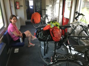 Da wir Abend noch zu einem Sommerfest in der Nähe von Burscheid angeladen waren, haben wir uns entschlossen, ab Münster den Zug zu nehmen. Als wir am Bahnhof angekommen waren und die Karten gekauft hatten, hatten wirnoch  ganze 5 Minuten, um den IC Richtung Hagen zu erreichen. Leider war der Zug extrem lang und auf dem Bahnsteig kein Bahnmitarbeiter, den man fragen konnte, wo denn der Wagon mit den Fahrrädern ist. Nach einigem Hin und Her erfuhren wir dann doch, dass dieser am entgegengesetzten Ende des Zuges war und so fuhren wir dann mit recht hoher Geschwindigkeit über den Bahnsteig und schafften es dann noch Sekunden vor der Abfahrt, die Räder in den Zug zu hieven. Beim Umsteigen in Hagen merkten wir dann schnell dass insbesondere mein Rad nicht für das Hoch- und Runtertragen in den Bahnhöfen geeignet ist, da der einzige Fahrstuhl dort ca. 30 cm zu klein war. Glücklicherweise fand sich dann ein hilfsbereiter junger Mann, der uns half das Rad die Treppe hoch zu tragen.