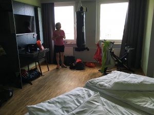 Die nächste Überraschung hielt dann unser Hotelzimmer in Remscheid bereit. Ich habe ja schon in vielen Hotels übernachtet, aber dass uns dann eine stattliche Anzahl von Sportgeräten erwarteten, das hatte ich so noch nicht erlebt. Unter anderem waren im Zimmer ein Ergometer, ein Boxsack mit Handschuhen, eine Sprossenwand, eine Trainingsmatte mit Trainingsprogramm. Als ob wir noch nicht genug Sport gemacht hätten! Das Zimmer ist aber klasse.