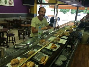 Es ging wirklich die gesamte Zeit in kurvigen Strecken stramm rauf und runter. Meine Durchschnittsgeschwindigkeit im Auto betrug ca. 30 km/h. Nach 2 Stunden brach ich das Experiment ab und fuhr auf die Hauptstraße. Dort ging es dann schon schneller voran. Die Mittagspause wollte ich dann irgendwo in der Nähe von Bilbao verbringen – soweit der Plan. Das gestaltete sich doch deutlich komplizierter als gedacht. Zwar fand ich eine Menge an Bars und Restaurants jedoch keinen einzigen Parkplatz. So kurvte ich durch die Einbahnstraßen der Vorstädte von Bilbao. Nach ungefähr einer Stunde wollte ich aufgeben und fasste den Entschluss, jetzt mal richtig Strecke zu machen. Immerhin lagen zu diesem Zeitpunkt noch ungefähr 2/3 des Weges vor mir und es war schon 14 Uhr. Als ich 500 Meter vor der Autobahn plötzlich tatsächlich die Kombination aus freiem Parkplatz und Restaurant entdeckte. Ich machte Pause in einer für diese Region typischen Bars, in der am Tresen vorbereitete Gerichte angeboten werden.