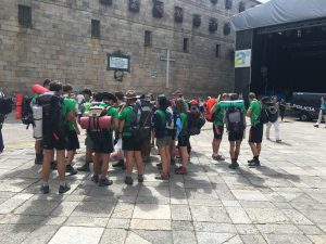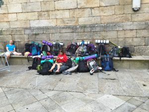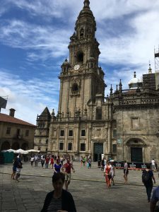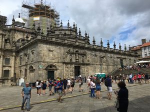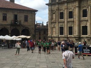 Nach dem Frühstück und dem nur teilweise erfolgreichen Versuch, dem Hotelinhaber den Ablauf meiner Reise auf spanisch zu erklären, ging es dann weiter im Auto Richtung Santiago de Compostela. Nachdem ich das Buch von Hape Kerkeling vor ein paar Jahren gelesen habe und ich nun auf der Fahrt immer wieder auf Wanderpilger, Radpilger, Pilgerhotels und andere Hinweise auf den Jakobsweg gestoßen bin, hat mich schon interessiert, was denn da in Santiago so los ist. Die Einfahrt in die Stadt ist zunächst recht unspektakulär. Auffällig war vielleicht, dass der Verkehr anders als in einigen der Städte, die ich bisher besucht habe recht ruhig floss. In das Stadtzentrum kam man gut hinein und auch einen Parkplatz konnte ich sofort gut finden. Schon beim Weg in die Altstadt begegnete ich überall Pilgern, deren Anzahl dann immer weiter zunahm je näher ich der imposanten Kathedrale kam. Die Maße kann man kaum richtig erfassen, da diese ein wenig in die Altstadt eingebaut ist und etwas verwinkelt wirkt. Das Gebäude ist jedoch wirklich beeindruckend. Die Stimmung drum herum erinnerte ein wenig an den Finish-Bereich einer Marathon Veranstaltung. Ich sah viele erschöpfte aber glückliche und zufriedene Menschen. Gewundert hat mich, wie viele junge Leute – um die zwanzig – unter den Pilgern waren. Das Ziel der Pilger nach der Ankunft ist dann die Umarmung und ein Kuss der Sitzfigur des heiligen Jakobus. Ich nahm -wie einige andere Touristen- den gleichen Weg wie die Pilger habe aber natürlich auf Umarmung und Kuss verzichtet (bin ja den Weg nicht gegangen oder gefahren).