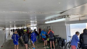 Heute Morgen habe ich ordentlich verschlafen. Aufgrund der Wärme im Zimmer habe ich nicht besonders gut geschlafen und habe den Wecker einfach ausgeschaltet und mich nochmals umgedreht. Das war heute aber nicht ganz so schlimm, weil es im Hotel erst um 7:30 Frühstück gab und ich damit die erste Fähre um 7:50 Uhr ohnehin kaum hätte erreichen können. Also ließ ich mir insgesamt etwas Zeit und peilte die Fähre um 9:35 an, was auch problemlos funktioniert hat. Gemeinsam mit ca. 100 anderen Radfahrern und Radfahrerinnen ging ich an Bord und genoss die rund 20 minütige Überfahrt auf die andere Seite der Bucht. Da ich das Navi nicht ausgeschaltet habe, sind mir so für den Tag 8 km „geschenkt“ worden. Die Statistik wird es verkraften.