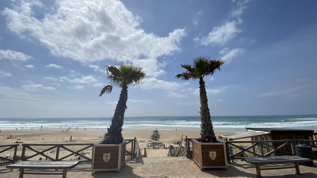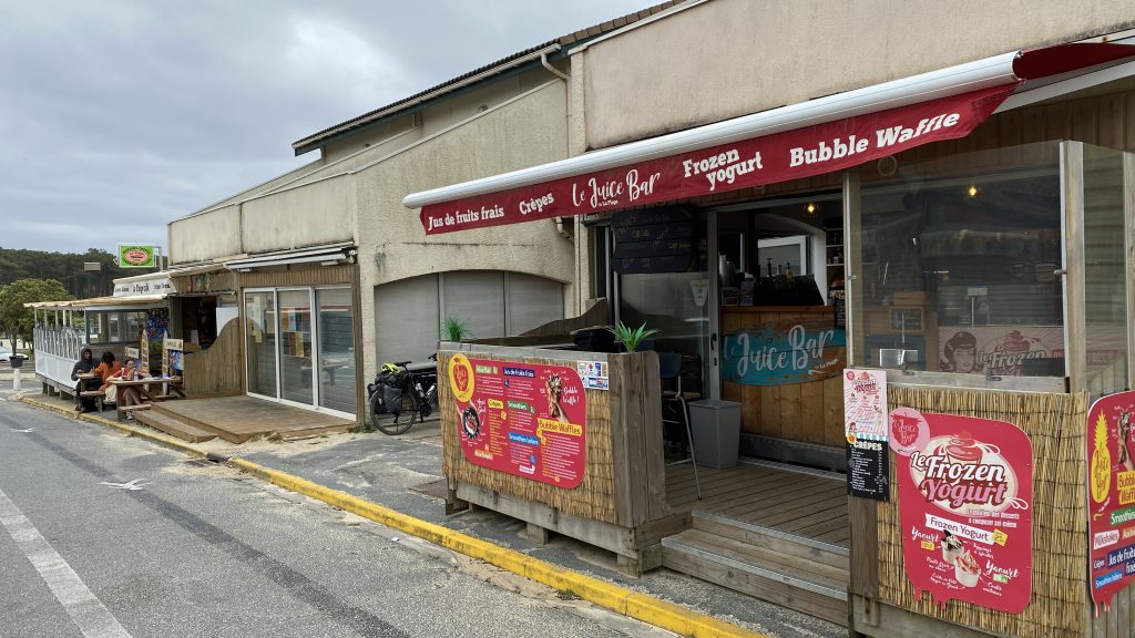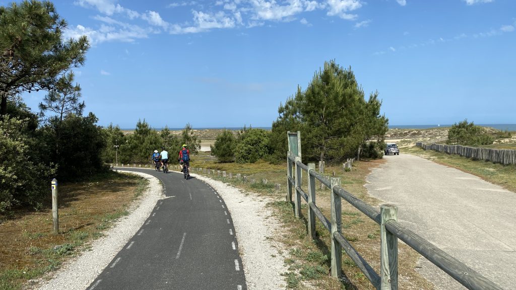 Von nun an ging es den ganzen Tag über sehr gut ausgebaute Wege am Atlantik entlang. Die Temperatur war und blieb angenehm bei um die 25 Grad. Es gab nur wenige Anstiege und der Wind kam aus Nordwest. Also perfekte Bedingungen. Auch wenn ich den ganzen Tag praktisch am Wasser entlangfuhr, so konnte ich den Ozean nur ab und zu sehen. Meist war die Sicht verdeckt von Pinienwäldern oder Dünen. Das hat aber die Freude an diesem Tag nicht beeinträchtigen können. Nach ca. 30 km ging an den Küstenort Montalivet und damit gab es Gelegenheit für eine kurze Pause mit Verpflegung – natürlich mit Blick auf das Wasser. Hier gab es auch die Gelegenheit, ein Radlerpärchen zu sprechen, die ich schon seit 2 Tagen immer mal wieder gesehen habe. Die beiden kommen aus Dänemark und haben sich das ganz gut aufgeteilt. Ich erinnere mich, dass die beiden mich vor zwei Tagen auf einer dieser fiesen Gegenwindstrecken überholt haben. Dabei hat sie, die mit E-Unterstützung unterwegs ist und voran gefahren ist, ihm damit den Windschatten bereitet. Irgendwie habe ich ihn da schon beneidet.