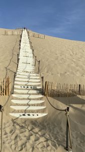 Zunächst bin ich wie angekündigt zur Dune di Pilat gefahren und bin dann entgegen meiner ursprünglichen Absicht auch hinauf gekraxelt. Anders als von Dibo angeregt, habe ich jedoch die Treppe genommen. Neben der Anstrengung, diese Düne im weichen Sand zu erklimmen, hat mich die Aussicht abgehalten, den ganzen Tag wie paniert auf dem Rad zu sitzen, da es natürlich bei der intensiven Sonne Pflicht ist, sich gut mit Sonnencreme zu schützen. Die Aussicht von dort oben ist wirklich grandios.