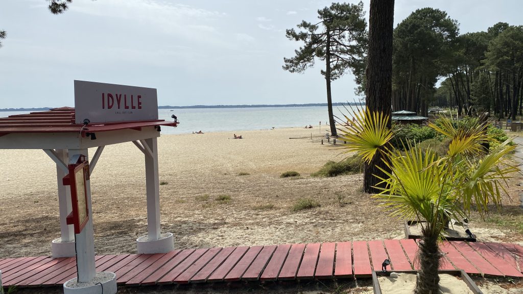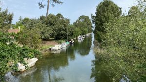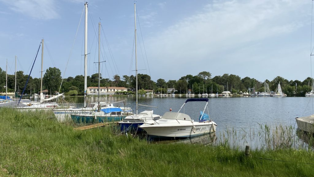 In Biscarrosse Plage gab es nach knapp 30 km Gelegenheit für einen Frühstückskaffee inmitten eines munteren Treibens. Dort war nämlich heute Markttag. Direkt danach führte mich die Route nach Osten, um ein größeres Naturschutzgebiet zu umfahren. Dabei ging es in einem wilden auf und ab mit engen Kurven durch die Dünen. Um dadurch zu kommen brauchte ich mindestens 10 mal den kleinsten Gang. Weiter ging es dann durch ein sehr schönes Urlaubs- und Freizeitgebiet an und zwischen zwei Binnenseen hindurch, die durch Wasserläufe mit einander verbunden sind. Überall lagen kleine Boote vor den Ferienhäusern; das ganze erinnerte stark an manche Gegenden in Holland.