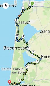 Das war es auch schon wieder für heute. Morgen geht es weiter auf dem EV 1 Richtung Süden. In Capbreton, kurz vor Biarritz habe ich mir eine Unterkunft reserviert. Die Strecke habe ich wieder mit gut 80 km kalkuliert. Da es morgen erst um 8 Uhr Frühstück gibt, kann ich eine Stunde länger schlafen als üblich. Temperaturen sollen wieder über 30 Grad steigen und am Nachmittag soll es Gewitter geben. Ich habe seit über 2 Wochen keinen Regen mehr gesehen. Warten wir es mal ab.