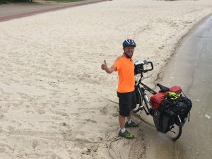 Und anschließend erfolgte dann das, was traditionell zu einer solchen Tour dazu gehört – der Wheeldip, also das Hinterrad in den Atlantik dippen (Das Vorderrrad kommt dann später in den Pazifik). Hier das Beweisfoto:
