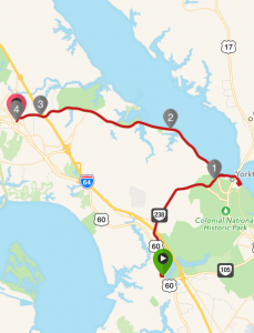 Nach Ansicht der Übernachtungsoptionen für die nächsten 200 km und des Wetterberichts habe ich mich entschlossen heute nur eine kleine Etappe von knapp 33 km zu fahren, davon ca. 21 auf der eigentlichen TransAm Tour. Hintergrund ist, dass die Alternative heute gewesen wäre rd. 130 km zu fahren und ab Mittag in der Region schwere Gewitter angekündigt waren. Zudem hatte ich so die Möglichkeit, den historischen Bezirk von Williamsburg zu besuchen.