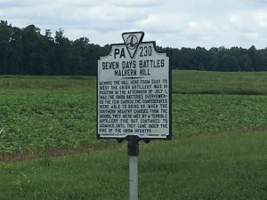An der Stelle musste ich dann nach meiner Karte leider den Capital Trail verlassen und einen nördlichen Kurs (ohne Radweg) einschlagen. Der verlief über eine mäßig befahrene Landstraße durch Wälder und an Wiesen und Feldern vorbei. Dabei passierte ich dann auch den Richmond National Battlefield Park, wieder ein ganzer Park mit Hinweisen auf die damalifgen Schlachten. Da stehen dann auch öfter mal Kanonen irgendwo auf dem Feld.