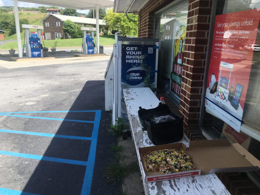 Kurz vor dem abzusehenden ersten längeren Anstieg fand ich dann eine Möglichkeit, meine Reserven etwas aufzufüllen. An einer Tankstelle gab es eine ganz passable Pizza – leider ohne jede Sitzgelegenheit. Egal, so stand ich dann eben an der Tankstelle, den Pizzakarton auf einem windschiefen Regal stehend und ließ es mir schmecken.