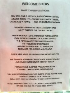 Es war bereits 17:30, als ich dann an einer Kirche vorbeifuhr, die in der Karte als Übenachtungsmöglichkeit gekennzeichnet war. Ich hielt an – kein Mensch da. In der Scheibe hing dieser Zettel: