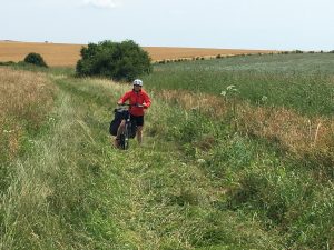 Leider war dieser schöne Weg dann irgendwann auch abgeradelt. Von da an hatten wir auf unserer Tour nach Verdun dann immer wieder die Wahl zwischen Pest und Cholera, was bedeutet, dass wir uns zwischen der Fahrt auf einer stark befahrenen Nationalstraße (ohne Radweg) oder unbefestigten Wegen entscheiden mussten. Als wir vom Verkehr etwas genervt dann den unbefestigten Wegen gefolgt sind, war der Start wirklich verheißungsvoll. Wir radelten einige Km auf einer geschotterten Piste bis diese dann plötzlich immer schmaler wurde und am Ende egentlich kein Weg mehr vorhanden war. Man konnte lediglich anhand der heruntergedrückten Wiese erkennen, dass hier schon mal irgend etwas lang gefahren war, vermutlich ein Traktor. Nach kurzer Beratung entschieden wir uns dafür weiter zu fahren und nicht umzukehren. Zunächst ging das auch erstaunlich gut, als dann auch noch eine Steigung dazu kam, war das Fahren schon brutal anstrengend. Sylvia entschied sich dann schon für das schieben. Ich blieb beim Fahren, war aber auch nur unbedeutend schneller.