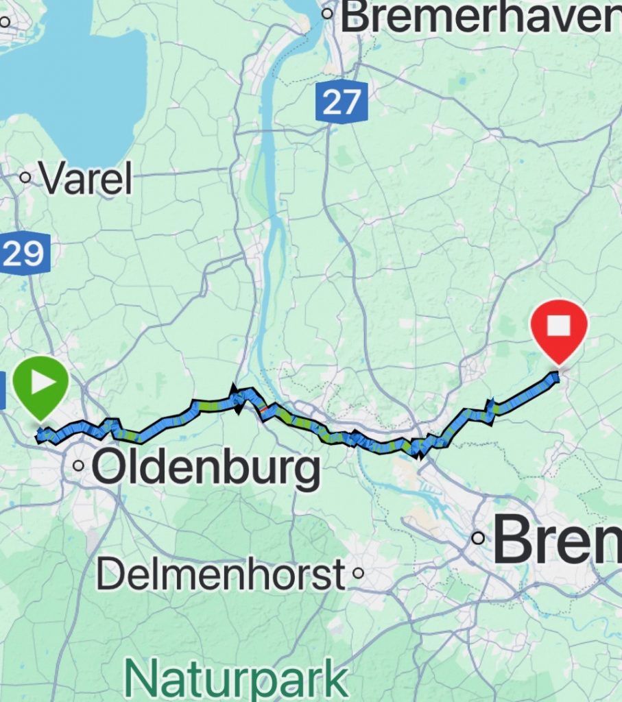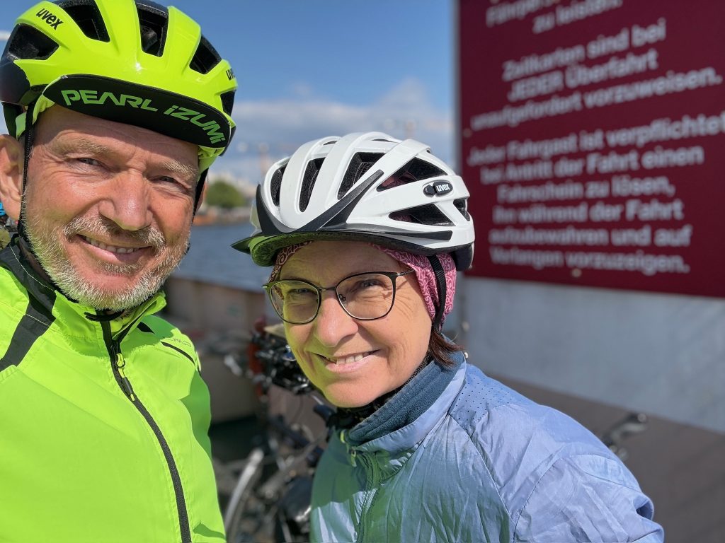 Die ersten 25 km fuhren wir über gut bekannte Strecken Richtung Berne. Kurz vor Berne führte uns die Strecke durch den malerischen Ort Dreisielen. Von dort ging es dann Richtung Fähre Lemwerder. Bei strahlendem Sonnenschein angenehm kühlen Temperatur trieb uns der Wind vor sich her. So fiel das Treten dann auch entsprechend leicht und wir kamen auch mit unseren Bio Bikes gut voran. Kurz vor der Fähre gab es dann den einzigen Dämpfer des Tages. Wegen einer Sperrung mussten wir einen Umweg fahren und dabei doch tatsächlich einige hundert Meter gegen den Wind fahren.