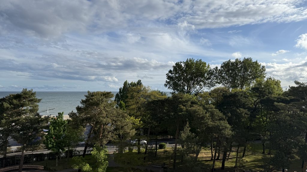 Der Tag begann mit einem kleinen Geschenk: Beim Aufziehen der Vorhänge offenbarte sich ein Postkartenblick auf die Ostsee – strahlend blau, glitzernd, und keine Spur mehr von den dunklen Gewitterwolken des Vortags. Das Hotel-Frühstück war solide und stärkend, also nichts wie los – heute stand die Etappe von Kühlungsborn über Warnemünde nach Güstrow an.